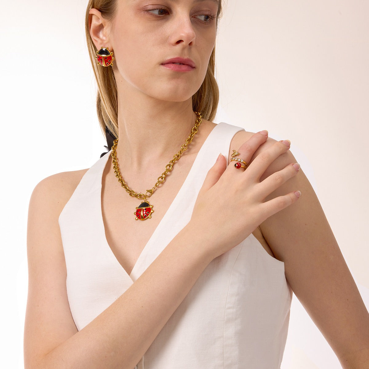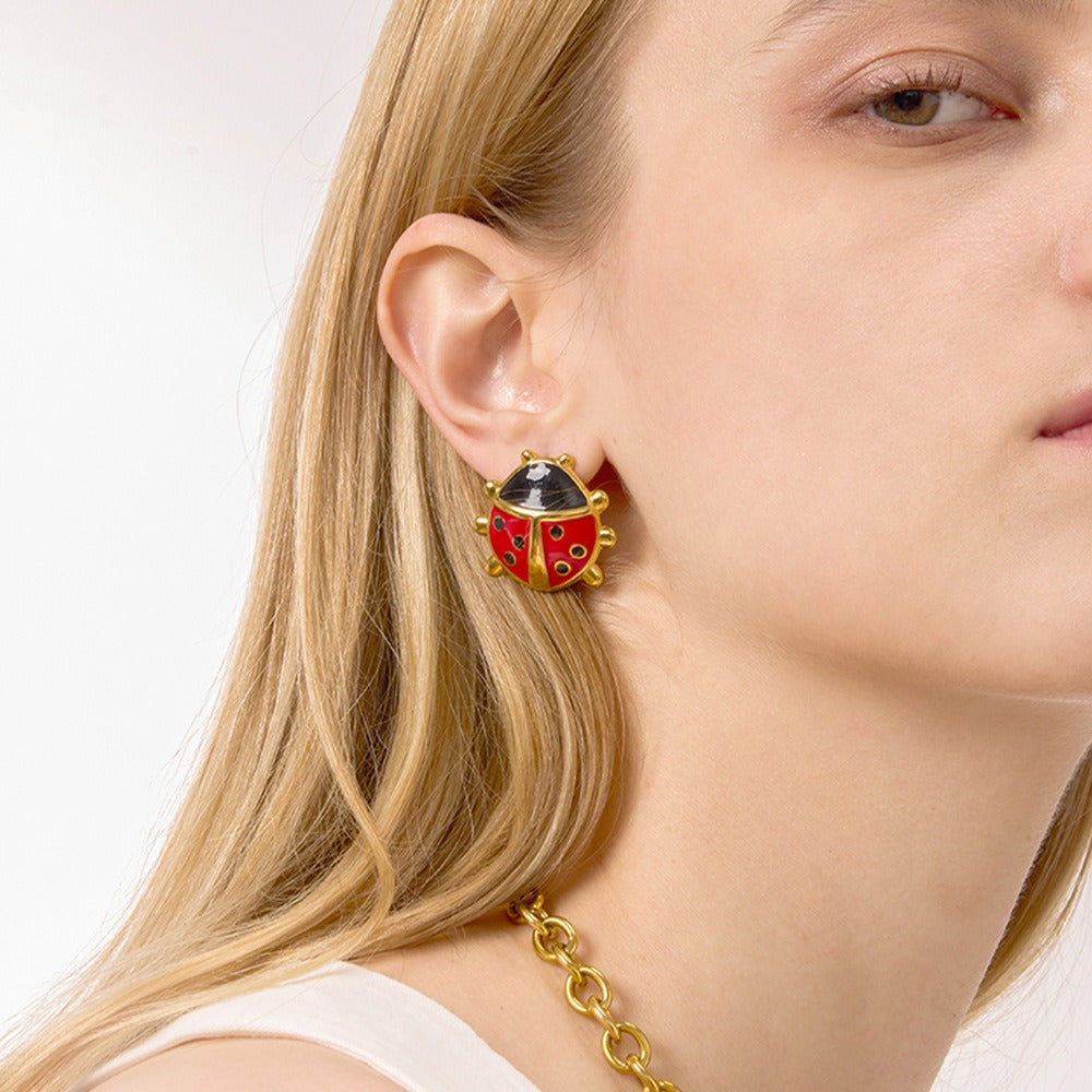 This jewelry set is inspired by natural insects, cleverly blending lively shapes with exquisite dripping techniques. Combined with the 18K gold finish, it presents a playful yet sophisticated light luxury style. The earrings and necklace complement each other, making the overall outfit more cohesive and eye-catching.